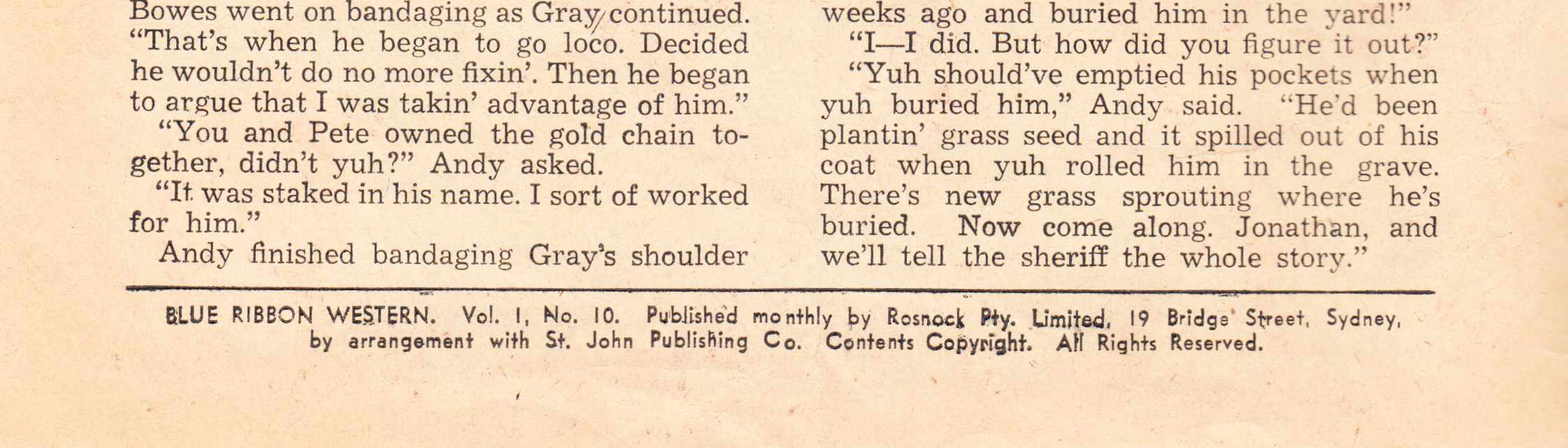 Blue Ribbon Western, Vol. 1, No. 10. Published monthly by Rosnock Pty. Limited, 19 Bridge Street, Sydney, by arrangement with St. John Publishing Co. Contents Copyright. All rights reserved. Drawn and printed in Australia by Jayar Studios and Associated Newspapers Ltd.