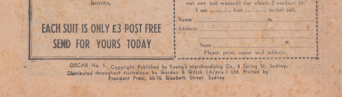 Oscar No. 1. Copyright. Published by Young's Merchandising Co., 8 Spring St., Sydney. Distributed throughout Australasia by Gordon & Gotch (A/asia) Ltd., Printed by President Press, 60-70 Elizabeth Street, Sydney.