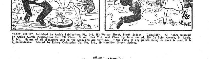 "Katy Keene". Published by Archie Publications Pty. Ltd. 153 Walker Street, North Sydney. Copyright. All rights reserved by Archie Comic Publications Inc., 141 Church Street, New York, and Close Up Incorporated, 420 De Soto Avenue, St. Louis, 7 Mo. Names of all characters used in the magazine are fictitious. If the name of any person living or dead is used, it is a coincidence. Printed by Rotary Colorprint Co. Pty. Ltd., 16 Hamilton Street, Sydney.