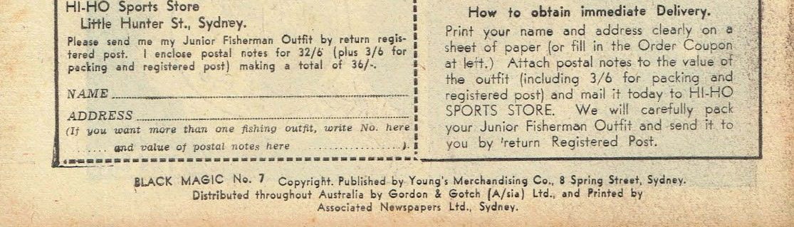 Black Magic No. 7. Copyright. Published by Young's Merchandising Co., 8 Spring Street, Sydney. Distributed throughout Australia by Gordon & Gotch (A/sia) Ltd., and printed by Associated Newspapers Ltd., Sydney.
