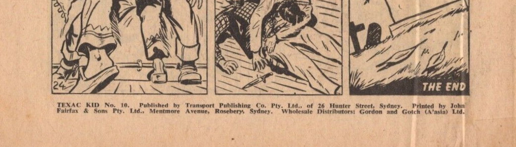 Texas Kid No. 10. Published by Transport Publishing Co. Pty. Ltd., of 26 Hunter Street, Sydney. Printed by John Fairfax & Sons Pty. Ltd., Mentmore Avenue, Rosebery, Sydney. Wholesale Distributors: Gordon and Gotch (A'asia) Ltd.
