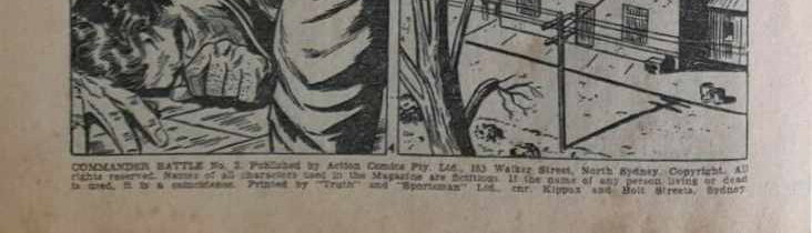 Commander Battle No. 2. Published by Action Comics Pty. Ltd., 183 Walker street, North Sydney. Copyright. All rights reserved. Names of all characters seen in the magazine are fictitious. If the name of any person living or dead is used, it is a coincidence. Printed by "Truth" and "Sportsman" Ltd., cnr. Kippax and Holt Streets, Sydney.