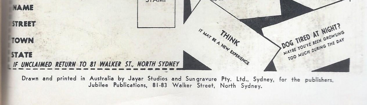 Drawn and printed in Australia by Jayar Studios and Sungravure Pty. Ltd., Sydney, for the publishers Jubilee Publications, 81-83 Walker Street, North Sydney.