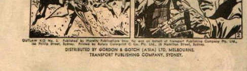 Outlaw Kid No. 3. Published by Horwitz Publications Inc. for and on behalf of Transport Publishing Company Pty. Ltd., 144 Phillip Street, Sydney. Printed by Rotary Colorprint Co. Pty. Ltd., 16 Hamilton Street, Sydney. Distributed by Gordon & Gotch (A'sia) Ltd, Melbourne, Transport Publishing Company, Sydney.
