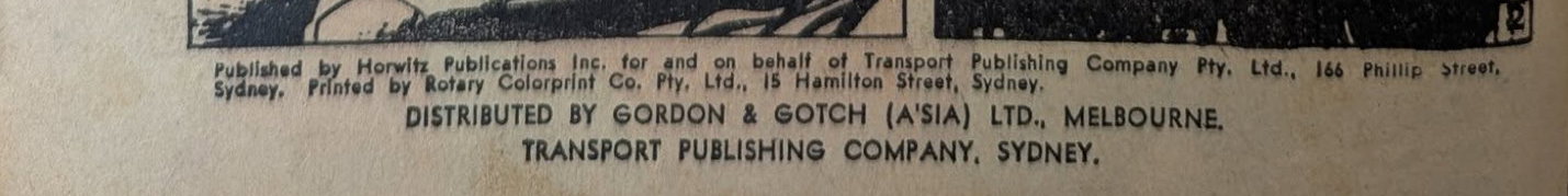 Published by Horwitz Publications Inc. for and on behalf of Transport Publishing Company Pty. Ltd., 166 Phillip Street, Sydney. Printed by Rotary Colorprint Co. Pty. Ltd., 15 Hamilton Street, Sydney. Distributed by Gordon & Gotch (A'sia) Ltd., Melborune, Transport Publishing Company, Sydney.
