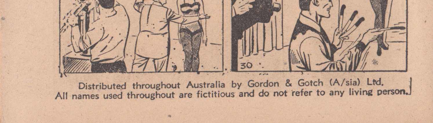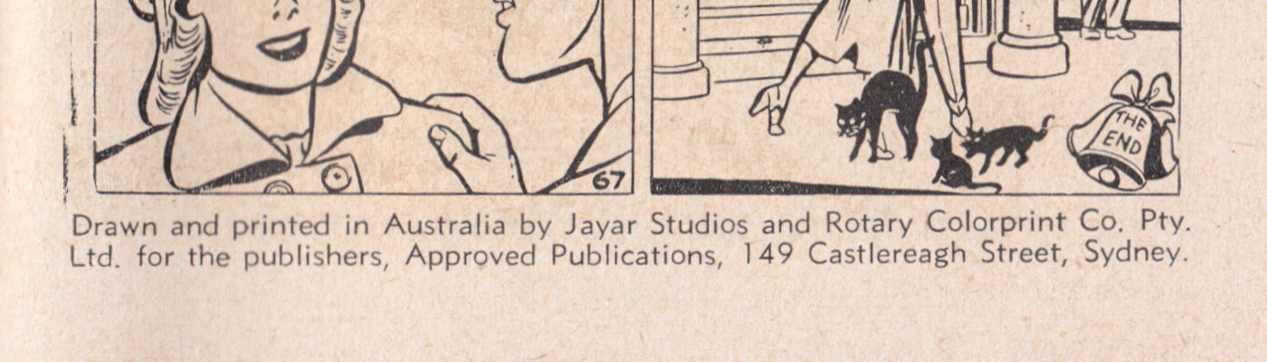 Drawn and printed in Australia by Jayar Studios and Rotary Colorprint Co. Pty. Ltd. for the publihsers, Approved Publications, 149 Castlereagh Street, Sydney. Distributed throughout Australia by Gordon & Gotch (A'sia) Ltd. All names used throughout are fictitious and do not refer to any living person.