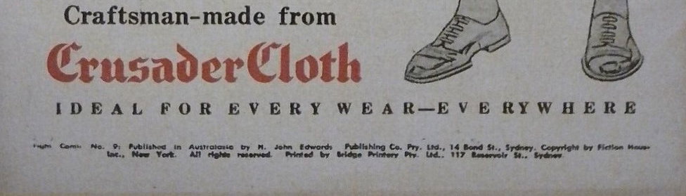 Fight Comics No. 9. Published in Australasia by H. John Edwards Publishing Co. Pty. Ltd., 14 Bond St., Sydney. Copyright Fiction House Inc., New York. All rights reserved. Printed by Bridge Printery Pty. Ltd., 117 Reservoir St., Sydney.