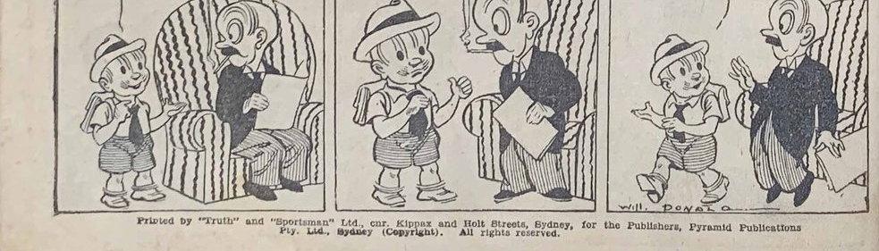 [Interior:] Printed by "Truth" and "Sportsman" Ltd., cnr Kippax and Holt Streets, Sydney, for the Publishers, Pyramid Publications Pty. Ltd., Sydney (Copyright). All rights reserved. [Cover:] Printed by Alanson Pty. Ltd., for the Publishers, Pyramid Publications Pty. Limited, Sydney (Copyright.) All rights reserved.