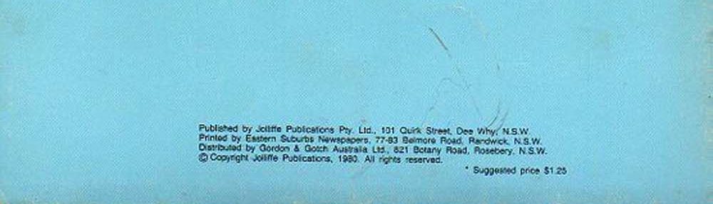 Published by Jolliffe Publications Pty. Ltd., 101 Quirk Street, Dee Why, N.S.W. Printed by Eastern Suburbs Newspapers 77-83 Belmore Road Randwick, N.S.W. Distributed by Gordon & Gotch Australia Ltd, 821 Botany Road, Rosebery, N.S.W. © Copyright Jolliffe Publications 1980. All rights reserved.