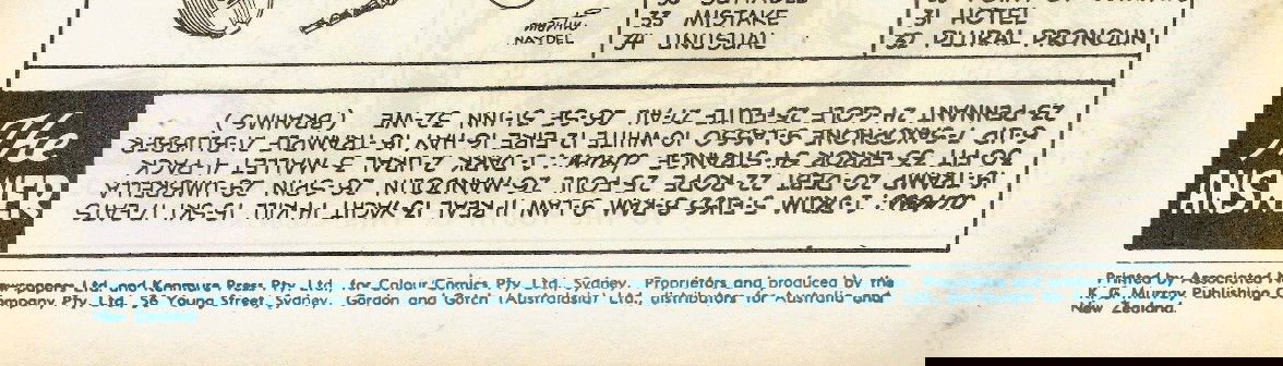 Printed by Associated Newspapers Ltd. And Kenmure Press Pty. Ltd., for Colour Comics Pty. Ltd., Sydney. Proprietors and produced by the K. G. Murray Publishing Company Pty. Ltd., 56 Young Street, Sydney. Gordon and Gotch (Australasia) Ltd., distributors for Australia and New Zealand.