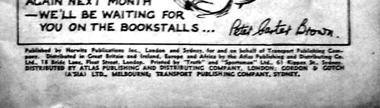 Published by Horwitz Publications Inc., London and Sydney, for and on behalf of Transport Publishing Company. Distributed in Great Britain and Ireland, Europe and Africa by the Atlas Publishing and Distributing Co. Ltd., 18 Bride Lane, Fleet Street, London. Printed by "Truth" and "Sportsman" Ltd., 61 Kippax St., Sydney. Distributed by Atlas Publishing and Distributing Company, London; Gordon @ Gotch (A'sia) Ltd., Melbourne; Transport Publishign Company, Sydney.