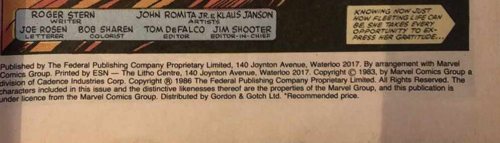Published by The Federal Publishing Company Proprietary Limited, 140 Joynton Avenue, Waterloo 2017. By arrangement with Marvel Comics Group. Printed by ESN--The Litho Centre, 140 Joynton Avenue, Waterloo 2017. Copyright © 1983, by Marvel Comics Group a division of Cadence Industries Corp. Copyright ® 1986 The Federal Publishing Company Proprietary Limited. All Rights Reserved. The characters included in this issue and the distinctive likenesses thereof are the properties of the Marvel Group, and this publication is under licence from the Marvel Comics Group. Distributed by Gordon & Gotch Ltd.