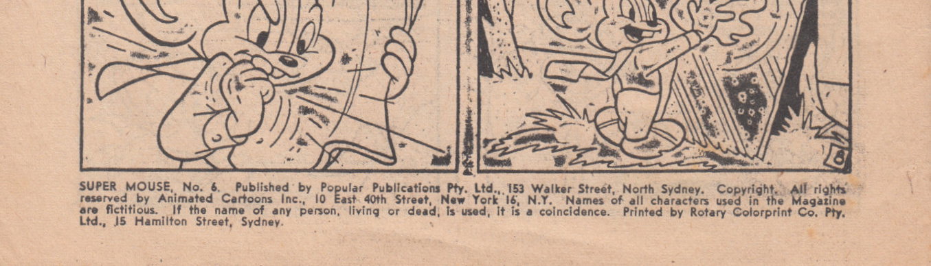 Super Mouse, No. 6. Published by Popular Publications Pty. Ltd., 153 Walker Street, North Sydney. Copyright. All rights reserved by Animated Cartoons Inc., 10 East 40th Street, New York 16, N.Y. Names of all characters used in the Magazine are fictitious. If the name of any person, living or dead, is used, it is a coincidence. Printed by Rotary Colorprint Co. Pty. Ltd., 15 Hamilton Street, Sydney.