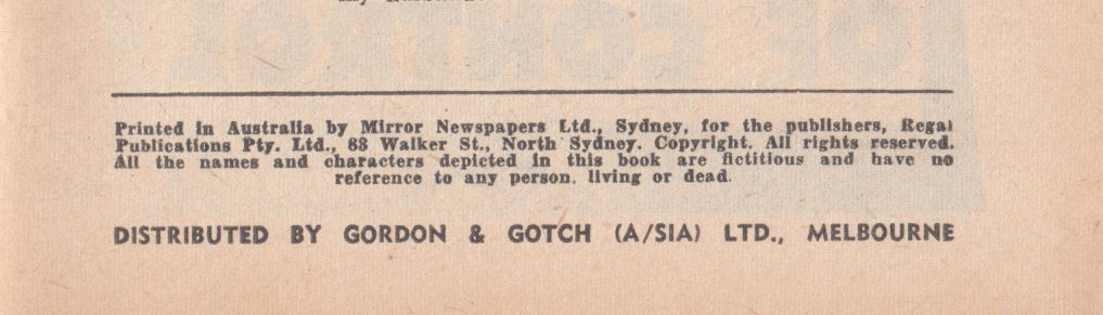 Printed in Australia by Mirror Newspapers Ltd., Sydney, for the publishers, Regal Publications Pty. Ltd., 83 Walker St., North Sydney. Copyright. All rights reserved. All names and characters depicted in this book are fictitious and have no reference to any person, living or dead. Distributed by Gordon & Gotch (A/sia) Ltd., Melbourne.