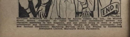 Picture Romance No. 84.--Published by Apache Comics Pty. Ltd., 144 William Street, Sydney. Copyright. All rights reserved. Any resemblance between any character appearing in this magazine, and any person living or dead, is entirely coincidential and unintentional. Distributors, Gordon and Gotch (Australasia) Ltd. New Zealand Distributors: Marketing Services (N.Z.) Ltd. Printed by Cumberland Newspapers Limited, Macquarie Street, Parramatta.