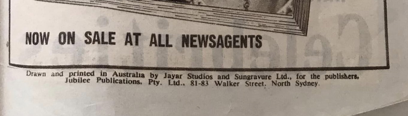 Drawn and printed in Australia by Jayar Studios and Sungravure Ltd., for the publishers, Jubilee Publications, Pty. Ltd., 81-83 Walker Street, North Sydney.