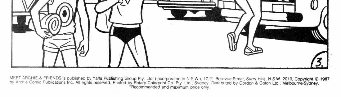 Meet Archie & Friends is published by Yaffa Publishing Group Pty. Ltd (incorporated in N.S.W.), 17-21 Bellevue Street, Surry Hills, N.S.W. 2010. Copyright © 1987 by Archie Comic Publications Inc. All rights reserved. Printed by Rotary Colorprint co. Pty. Ltd., Sydney. Distributed by Gordon & Gotch Ltd., Melbourne-Sydney.