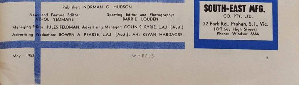 Wheels is published by Hudson Publications, 3 Rawson Place, Sydney, N.S.W., Australia, also of Auckland, N.Z. This magazine is wholly set up and printed by City Printers, 796 George Street, Sydney, Published monthly.