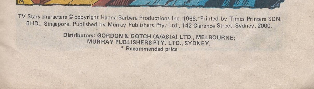 TV Stars characters © copyright Hanna-Barbera Productions Inc. 1966. Printed by Times Printers SDN. BHD., Singapore. Published by Murray Publishers Pty. Ltd., 142 Clarence Street, Sydney, 2000. Distributors: Gordon & Gotch (A/asia) Ltd., Melbourne; Murray Publishers Pty. Ltd., Sydney.