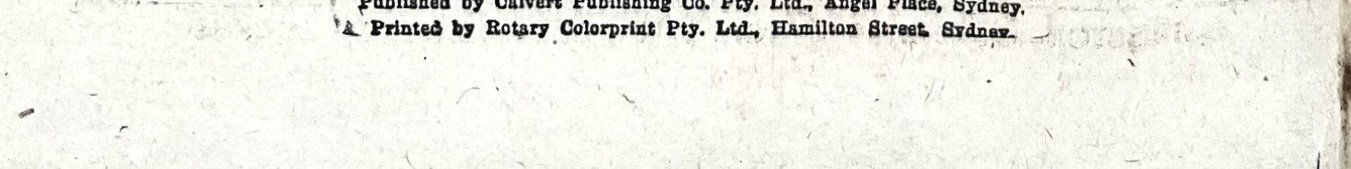 Printed by Calvert Publishing Co. Pty. Ltd., Angel Place, Sydney. Printed by Rotary Colorprint Pty. Ltd., Hamilton Street, Sydney.