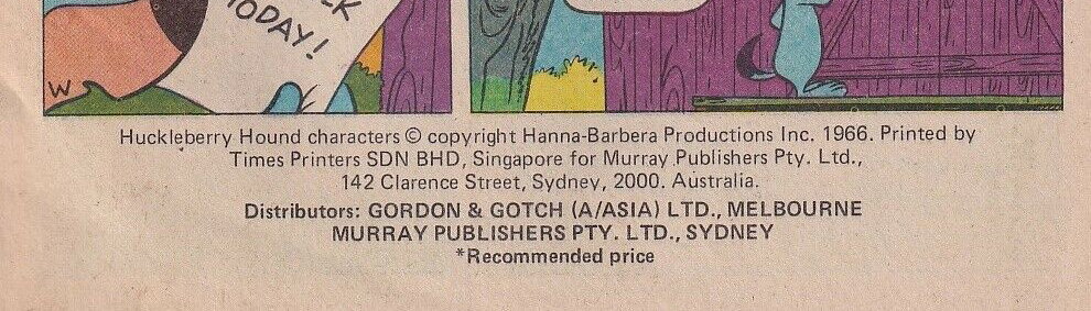 Huckleberry Hound characters © copyright Hanna-Barbera Productions Inc. 1966. Printed by Times Printers SDN BHD, Singapore for Murray Publishers Pty. Ltd., 142 Clarence Street, Sydney 2000. Australia. Distributors: Gordon & Gotch (A/asia) Ltd., Melbourne, Murray Publishers Pty. Ltd., Sydney.