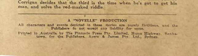 A "Novelle" Production. Printed in Australia by The Pinnacle Press Pty. Limited, Hume Highway, Bankstown, for the Publishers, Ayers & James Pty. Ltd., Sydney.