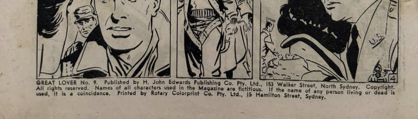 Great Lover No. 9. Published by H. John Edwards Publishing Co. Pty. Ltd., 153 Walker Street, North Sydney. Copyright. All rights reserved. Names of all characters use in the Magazine are fictitious. If the name of any person living or dead is used, it is a coincidence. Printed by Rotary Colorprint Co. Pty. Ltd., 15 Hamilton Street, Sydney.
