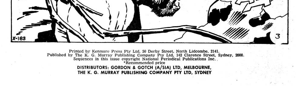 Printed by Kenmure Press Pty Ltd, 50 Derby Street, North Lidcombe, 2141. Published by The K. G. Murray Publishing Company Pty Ltd, 142 Clarence Street, Sydney, 2000. Sequences in this issue Copyright National Periodical Publications Inc. Distributors: Gordon & Gotch (A/sia) Ltd, Melbourne; The K. G. Murray Publishing Company Pty Ltd, Sydney.