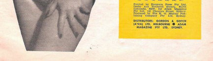 Printed by Kenmure Press Pty Ltd, Derby and Wetherill Streets, North Lidcombe, NSW for Adam Magazine Pty Ltd, 142 Clarence Street. Produced by The K. G. Murray Publishing Company Pty. Ltd., Sydney. Distributors: Gordon & Gotch (A/sia) Ltd., Melbourne. Adam Magazine Pty Ltd, Sydney.