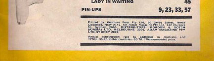 Printed by Kenmure Press Pty Ltd, Derby and Wetherill Streets, North Lidcombe, NSW for Adam Magazine Pty Ltd, 142 Clarence Street. Produced by The K. G. Murray Publishing Company Pty. Ltd., Sydney. Distributors: Gordon & Gotch (A/sia) Ltd., Melbourne. Adam Magazine Pty Ltd, Sydney.