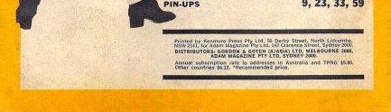 Printed by Kenmure Press Pty Ltd, 52 Derby Street, North Lidcombe, NSW 2141, for Adam Magazine Pty Ltd, 142 Clarence Street, Sydney, 2000. Distributors: Gordon & Gotch (A/asia) Ltd, Melbourne, 3000. Adam Magazine Pty Ltd, Sydney 2000.