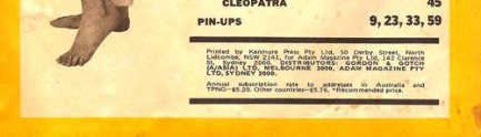 Printed by Kenmure Press Pty Ltd, Derby and Wetherill Streets, North Lidcombe, NSW for Adam Magazine Pty Ltd, 142 Clarence Street. Produced by The K. G. Murray Publishing Company Pty. Ltd., Sydney. Distributors: Gordon & Gotch (A/sia) Ltd., Melbourne. Adam Magazine Pty Ltd, Sydney.