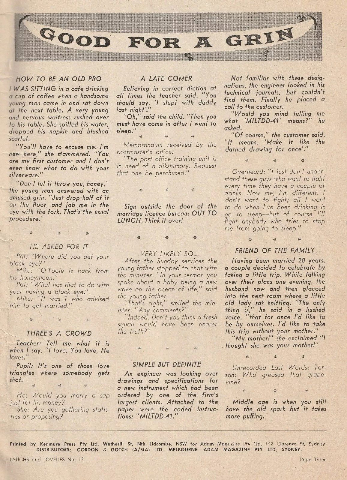Printed by Kenmure Press Pty Ltd, Wetherill St, Nth Lidcombe, NSW for Adam Magazine Pty Ltd, 142 Clarence St, Sydney. Distributors: Gordon & Gotch (A/sia) Ltd, Melbourne. Adam Magazine Pty Ltd, Sydney.