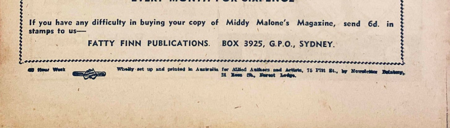 Wholly set up and printed in Australia for Allied Authors and Artists, 75 Pitt St., by Newsletter Printery, 21 Ross St., Forest Lodge.