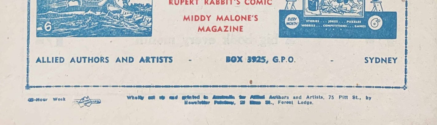 Wholly set up and printed in Australia for Allied Authors and Artists, 75 Pitt St., by Newsletter Printing,28 Ross St., Forest Lodge.