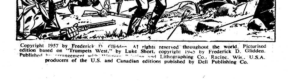 Copyright 1957 by Frederick D Glidden. All rights reserved throughout the world. Picturised edition based on "Trumpets West," by Luke Short, copyright 1945 by Frederick D. Glidden. Published by arrangement with Western Publishing and Lithographing Co., Racine, Wes., U.S.A. producers of the U.S. and Canadian editions published by Dell Publishing Co.