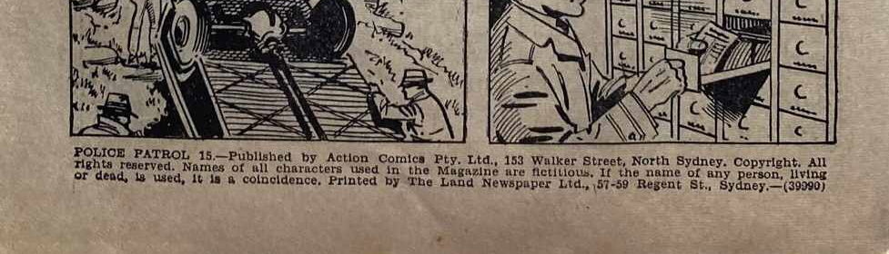 Police Patrol 15.--Published by Action Comics Pty. Ltd., 153 Walker Street, North Sydney. Copyright. All rights reserved. Names of all characters used in the magazine are fictitious. If the name of any person, living or dead, is used, it is a coincidence. Printed by The Land Newspaper Ltd., 57-59 Regent St., Sydney.--(39990)