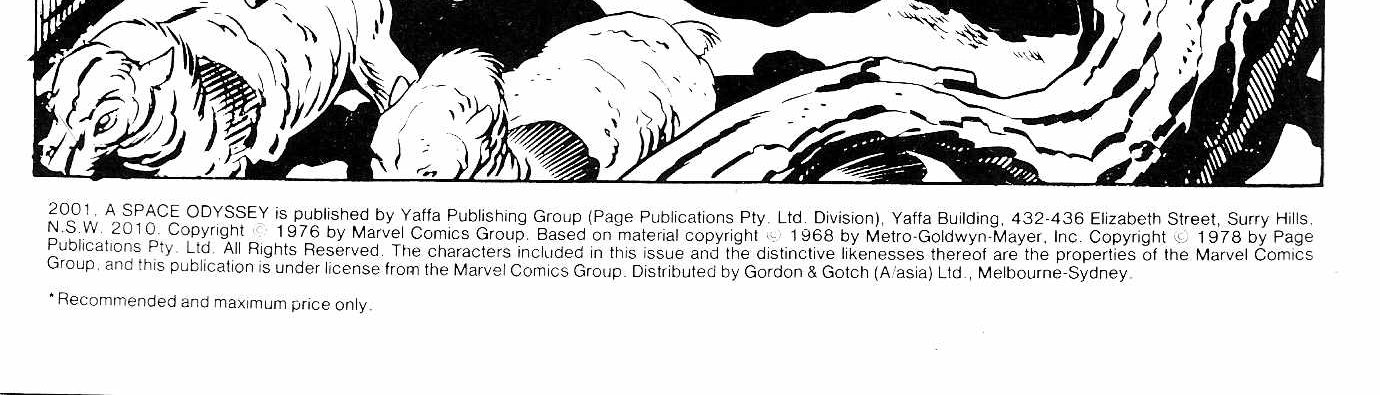 2001: A Space Odyssey is published by Yaffa Publishing Group (Page Publications Pty. Ltd. Division), Yaffa Building, 432-436 Elizabeth Street, Surry Hills, N.S.W. 2010. Copyright © 1976 by Marvel Comics Group. Based on magerial copyright © 1968 by Metro-Goldwyn-Mayer, Inc. Copyright © 1978 by Page Publications Pty. Ltd. All rights reserved. The characters included in this issue and the distinctive likenesses thereof are the properties of the Marvel Comics Group, and this publication is under license from the Marvel Comics Group. Distributed by Gordon & Gotch (A/asia) Ltd., Melbourne-Sydney.