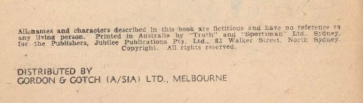 All names and characters described in this book are fictitious and have no reference to any living person. Printed in Australia by "Truth" and "Sportsman" Ltd., Sydney. for the publishers, Jubilee Publications Pty. Ltd., 83 Walker Street, North Sydney. Copyright. All rightsd reserved. Distributed by gordon & Gotch (A/sia) Ltd., Melbourne.