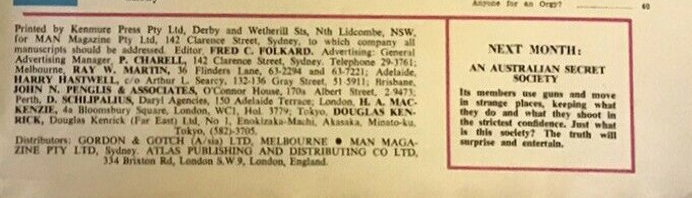 Printed by Kenmure Press Pty Ltd, Derby and Wetherill Sts, Nth Lidcombe, NSW, for Man Magazine Pty. Ltd., 142 Clarence Street, Sydney…