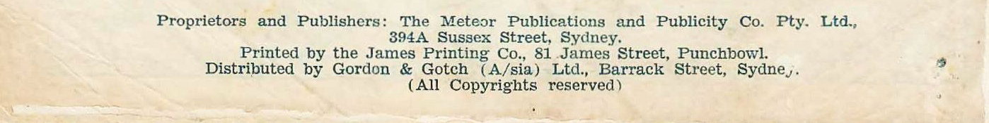 Proprietors and Publishers: The Meteor Publications and Publicity Co. Pty. Ltd., 394A Sussex Street, Sydney. Printed by the James Printing Co. 56 James Street, Punchbowl. Distributed by Gordon & Gotch (A/sia) Ltd., Barrack Street, Sydney. (All Copyright reserved)
