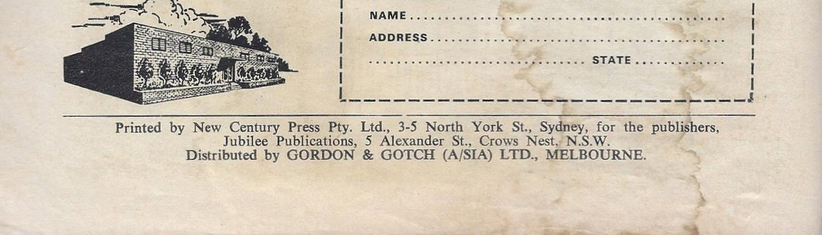 Printed by New Century Press Pty. Ltd., 3-5 North york St., Sydney, for the publishers, Jubilee Publications, 5 Alexander St., Crows Nest, N.S.W. Distributed by Gordon & Gotch (A/sia) Ltd., Melbourne.