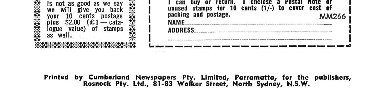 Printed by Cumberland Newspapers Pty. Limited, Parramatta, for the publishers, Rosnock Pty. Ltd., 81-83 Walker Street, North Sydney, N.S.W.