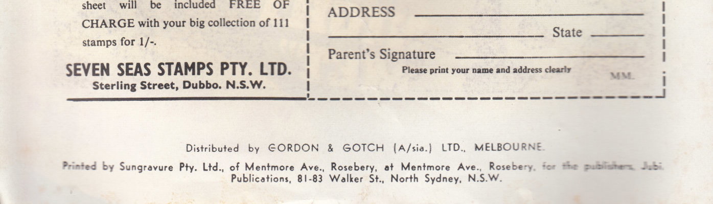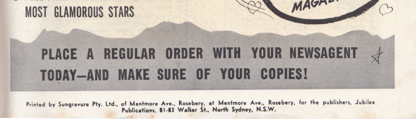 Distributed by Gordon & Gotch (A/sia) Ltd., Melbourne. Printed by Sungravure Pty. Ltd., of Mentmore Ave., Rosebery, at Mentmore Ave., Rosebery, for the publishers, Jubilee Publications, 81-83 Walker St., North Sydney, N.S.W.