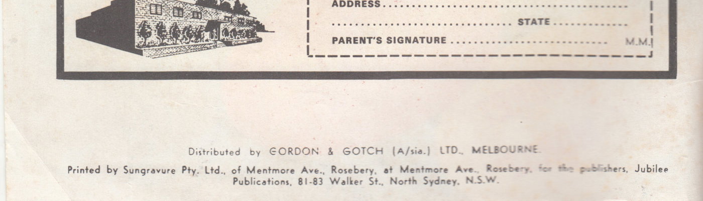 Distributed by Gordon & Gotch (A/sia.) Ltd., Melbourne. Printed by Sungravure Pty. Ltd., of Mentmore Ave., Rosebery, at Mentmore Ave., Rosebery, for the publishers, Jubilee Publications, 81-83 Walker St., North Sydney, N.S.W.