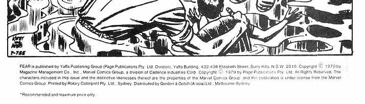 Fear is published by Yaffa Publishing Group (Page Publications Pty. Ltd. Division). Yaffa Building, 432-436 Elizabeth Street, Surry Hills, N.S.W. 2010. Copyright © 1970 by Magazine Management Co., Inc., Marvel Comics Group, a division of Cadence Industries Corp. Copyright © 1979 by Page Publications Pty. Ltd. All rights reserved. The characters included in this issue and the distinctive likenesses thereof are the properties of the Marvel Comics Group and this publication is under license from the Marvel Comics Grop. Printed by Rotary Colorprint Pty. Ltd., Sydney. Distributed by Gordon & Gotch (A'asia) Ltd. Melbourne-Sydney.