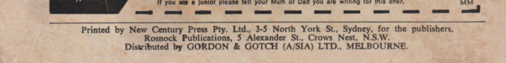Printed by New Century Press Pty. Ltd., 3-5 North York St., Sydney, for the Publishers, Rosnock Publications, 5 Alexander St., Crows Nest, N.S.W. Distributed by Gordon & Gotch (A/sia) Ltd., Melbourne.