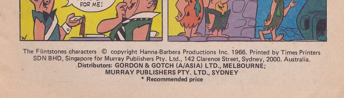 The Flintstones characters © copyright Hanna-Barbera Productions Inc. 1966. Printed by Times Printers SDN BHD, Singapore for Murray Publishers Pty. Ltd., 142 Clarence Street, Sydney, 2000, Australia. Distributors: Gordon & Gotch (A/asia) Ltd., Melbourne; Murray Publishers Pty. Ltd., Sydney.