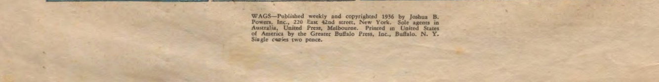 WAGS -- Published weekly and copyrighted 1936 by Joshua B. Powers, Inc., 220 East 42nd Street, New York. Sole agents in Australia, United Press, Melbourne. Printed in United States of America by the Greater Buffalo Press, Inc., Buffalo, N.Y. Single copies two pence.