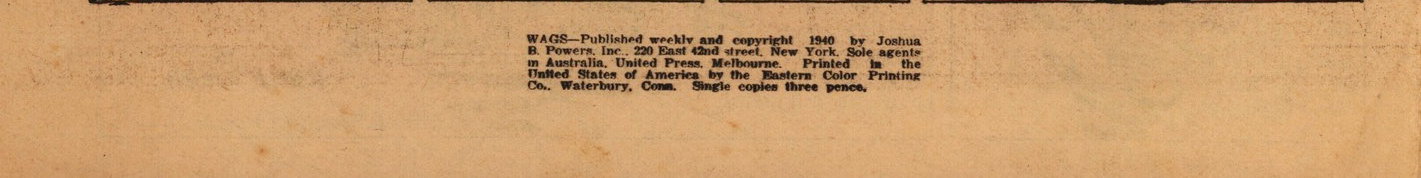 WAGS--Published weekly and copyright 1940 by Joshua B. Powers, Inc., 220 East 42nd street, New York. Sole agents in Australia, United Press Melbourne. Printed in the United States of America by the Eastern Color Printing Co., Waterbury, Conn. Single copies three pence.